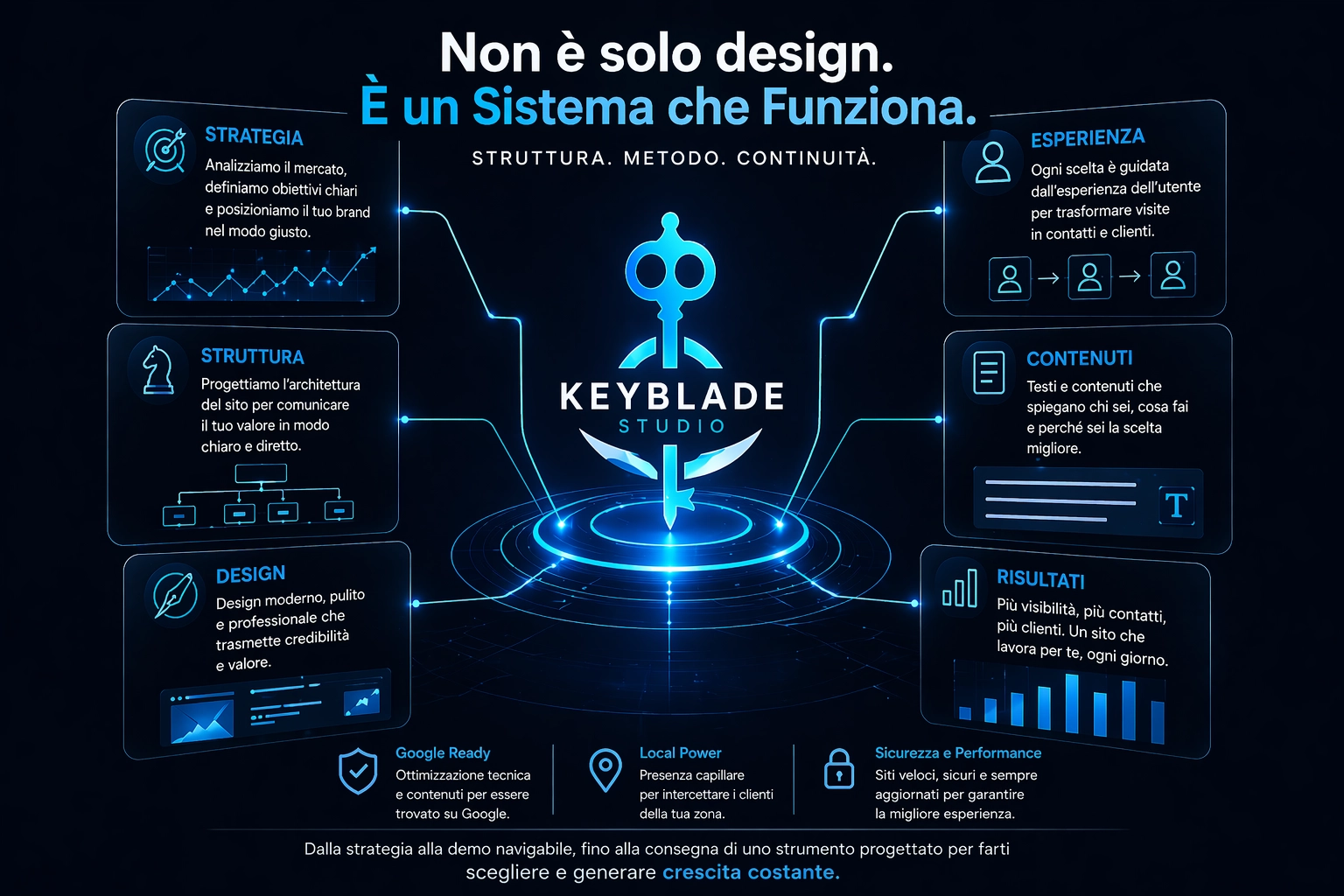Ti seguiamo passo dopo passo: dalla strategia alla demo navigabile, fino alla consegna di un sito progettato per farsi scegliere e farsi trovare su Google.